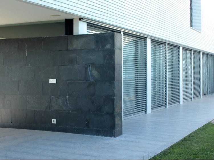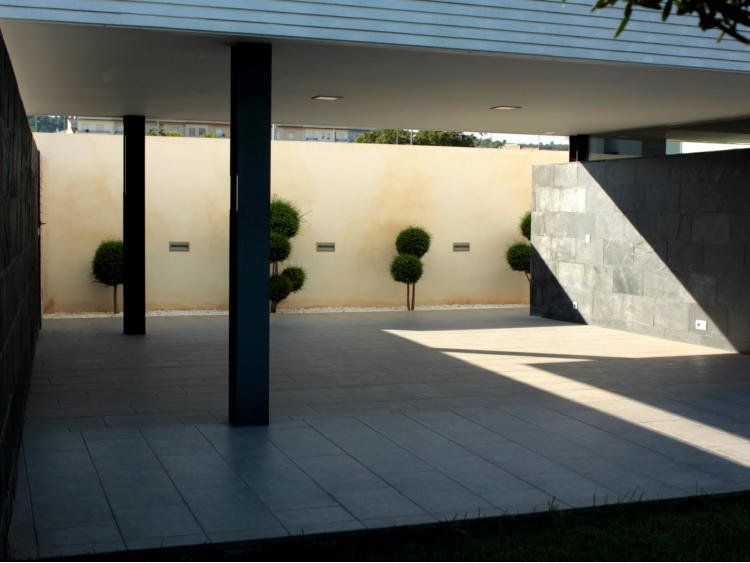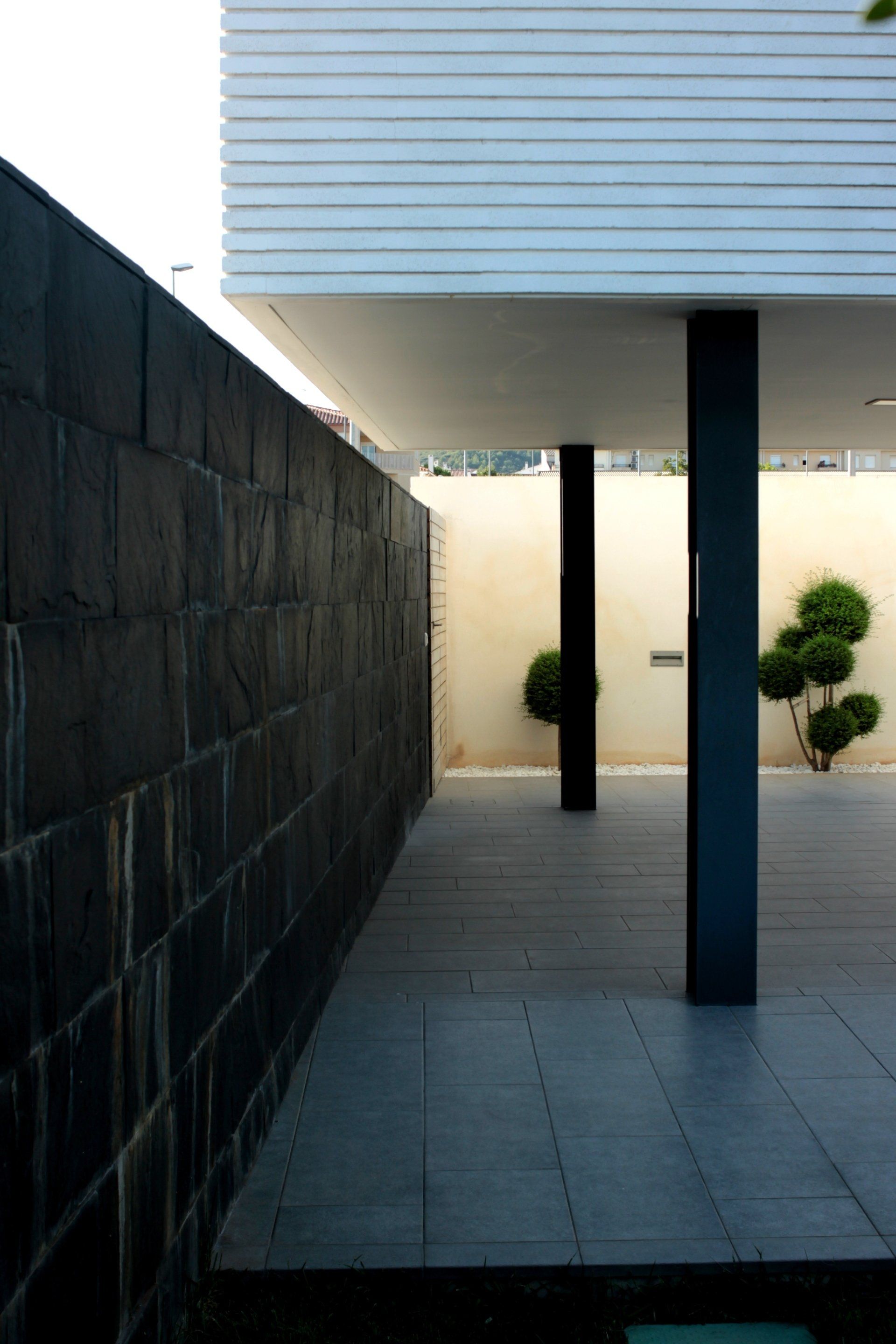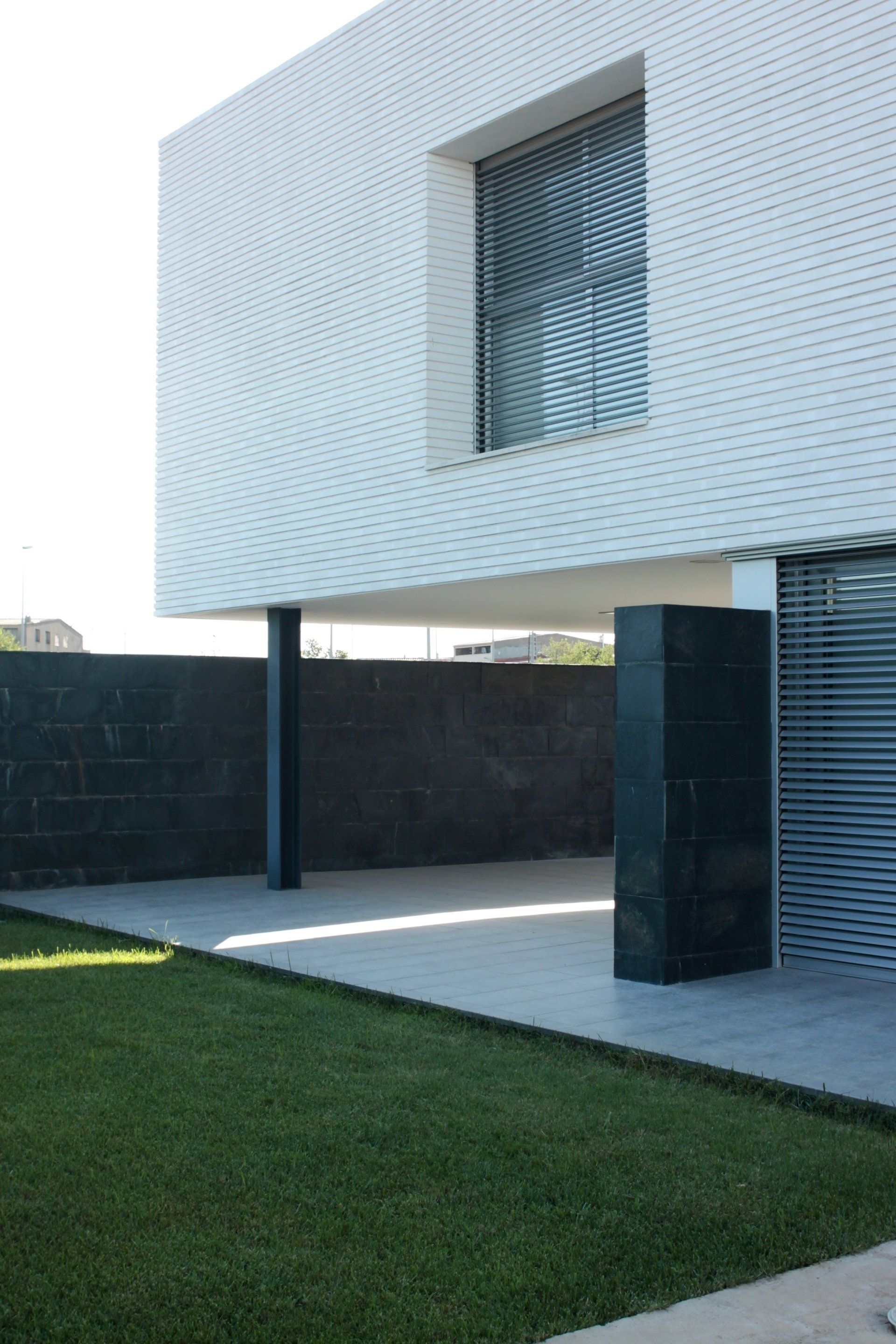 La vivienda se organiza mediante dos volúmenes puros y sencillos. El primer volumen cierra la parcela por el Norte y nos aísla de la contaminación acústica provocada por una carretera cercana. El segundo volumen se abre hacia el Sur “flotando” sobre un muro de vidrio que contrasta con la textura y la masa del ladrillo de hormigón blanco.